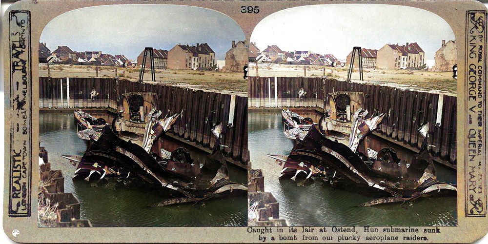 Caught in its lair at Ostend, Hun submarine sunk by a bomb from our plucky aeroplane raiders