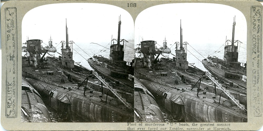 Fleet of murderous U boats, the greatest menace that ever faced our Empire, surrender at Harwich