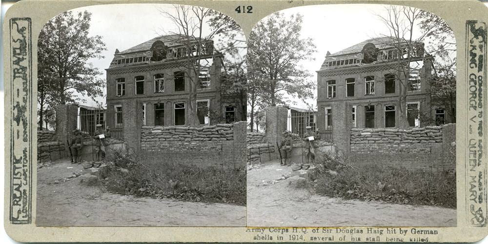 Army Corps H.Q. of Sir Douglas Haig hit by German shells in 1914, several of his staff being killed