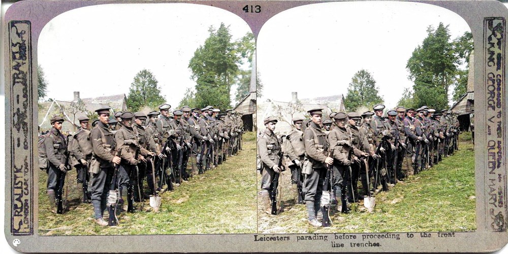 Image Id: 781 Contributor: The Jordan/Ference Collection Theatre: Western Front Subject: Behind the Lines Location: Unknown Regiment: Leicesters Service Arm: Infantry Battle: Unknown Date: Unknown Combatants: British Publisher: Realistic Travels Source: British Directory: Set of 600 401-500