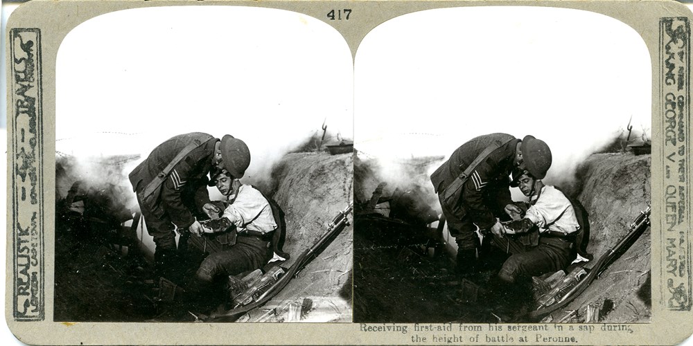 Receiving first-aid from his sergeant in a sap during the height of battle at Peronne