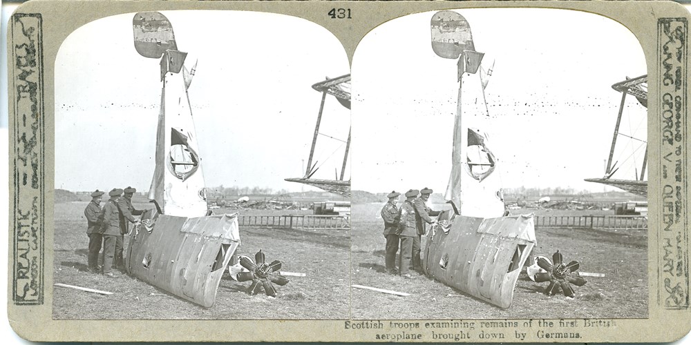 Scottish troops examining remains of the first British aeroplane brought down by Germans
