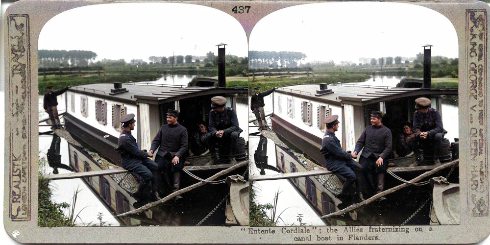 "Entente Cordiale"; the Allies fraternizing on a canal boat in Flanders