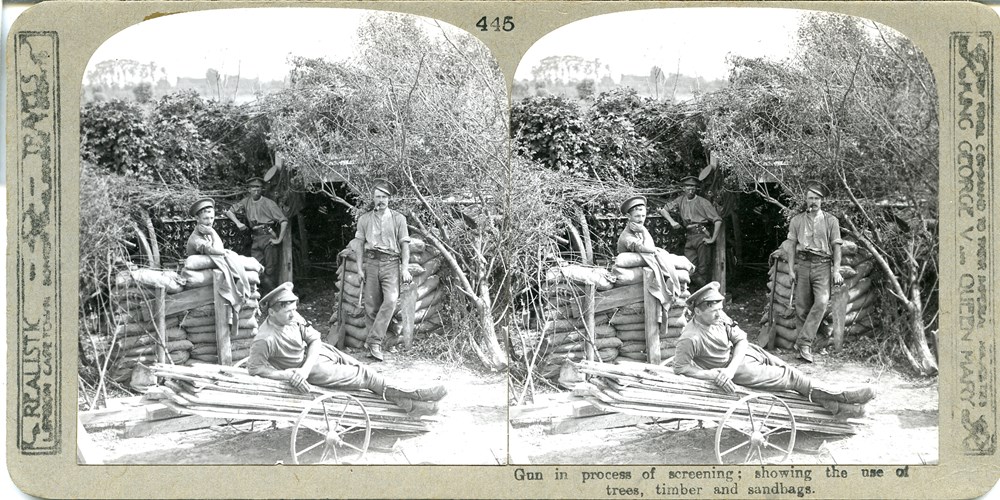 Gun in process of screening: showing the use of trees, timber and sandbags