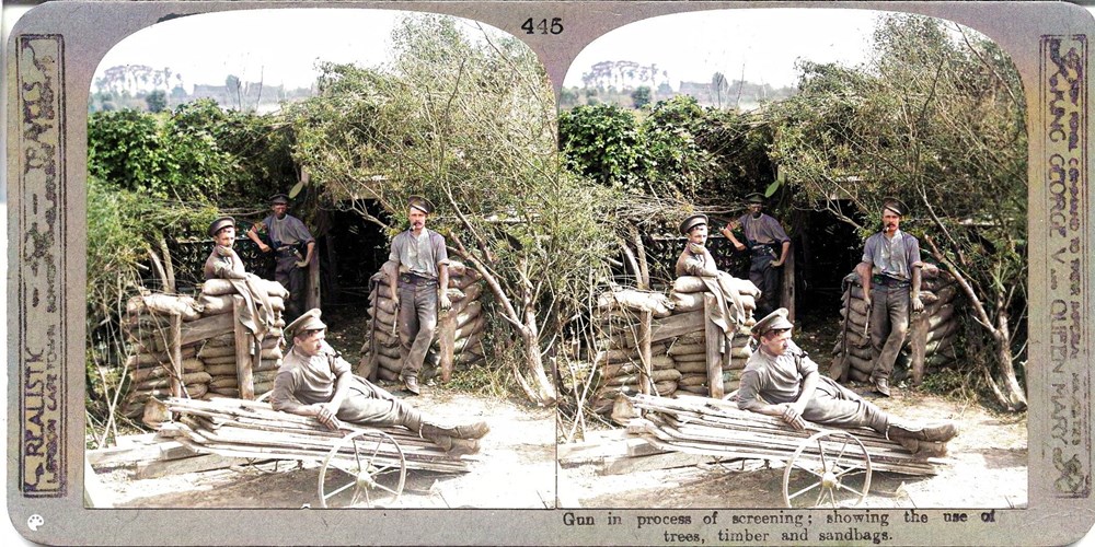 Gun in process of screening: showing the use of trees, timber and sandbags