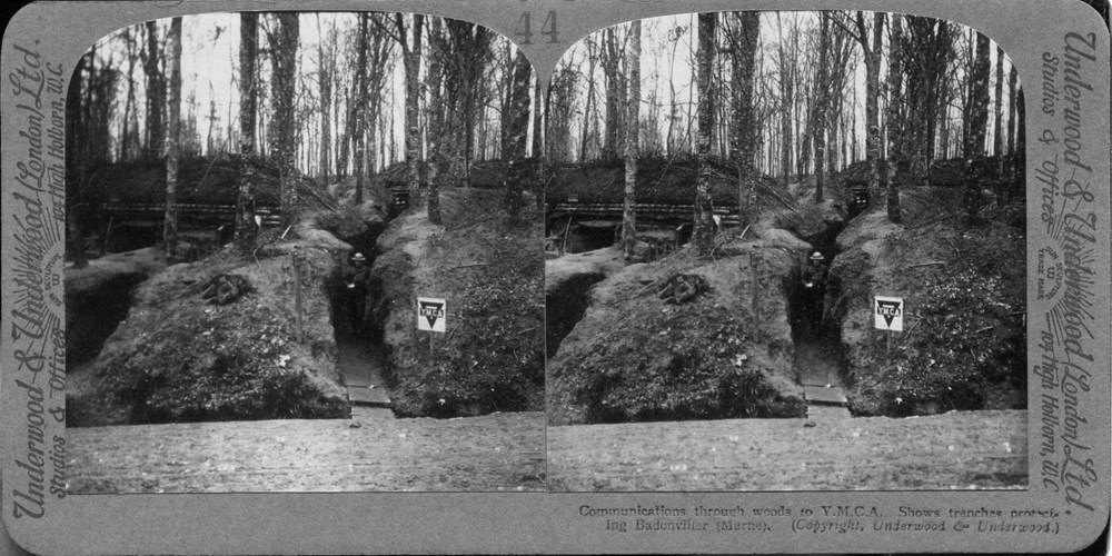 Commnunications through woods to Y.M.C.A. Shows trenches protecting Badonviller (Marne)