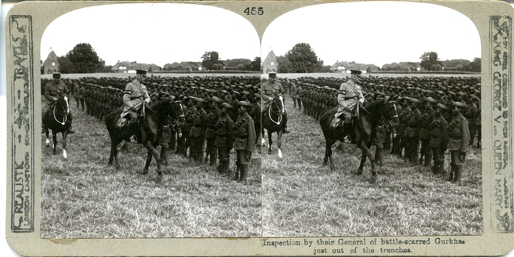Inspection by their General of battle-scarred Gurkhas just out of the trenches