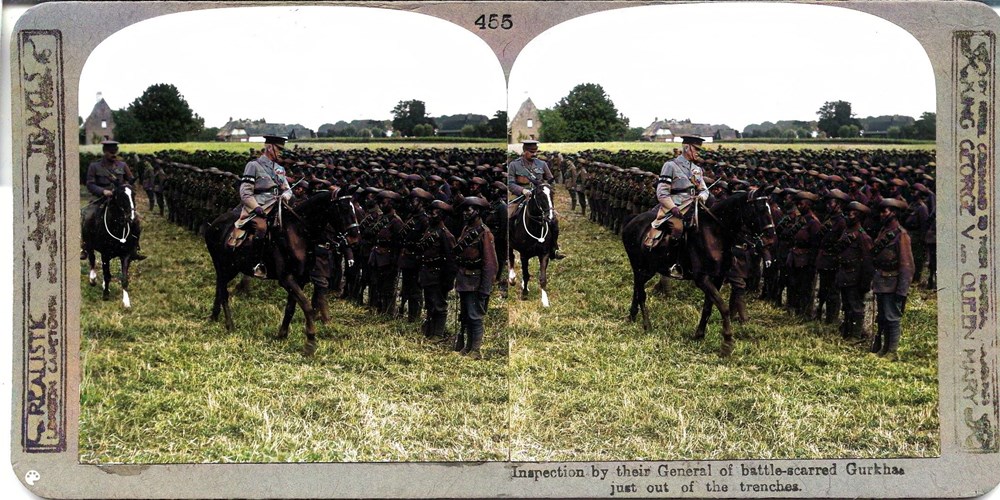 Inspection by their General of battle-scarred Gurkhas just out of the trenches