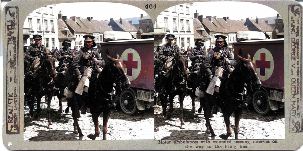 Motor ambulances with wounded passing reserves on the way to the firing line