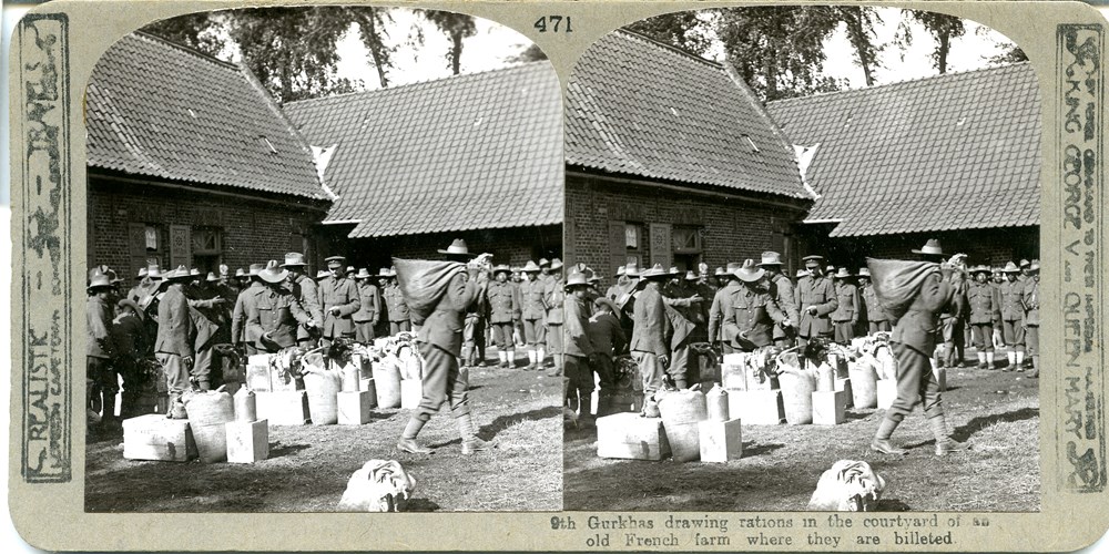 9th Gurkhas drawing rations in the courtyard of an old French farm where they are billeted