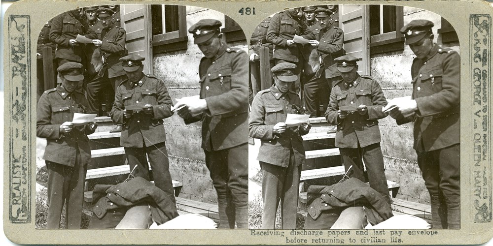 Receiving discharge papers and last pay envelope before returning to civilian life