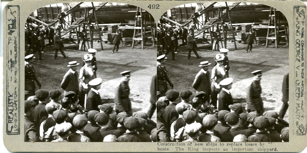 Construction of new ships to replace losses by "U" boats. The King inspects an important shipyard