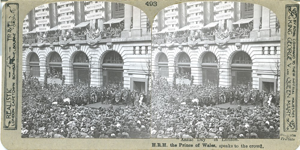H.R.H. The Prince of Wales addressing a huge crowd on Anzac day outside Australia House
