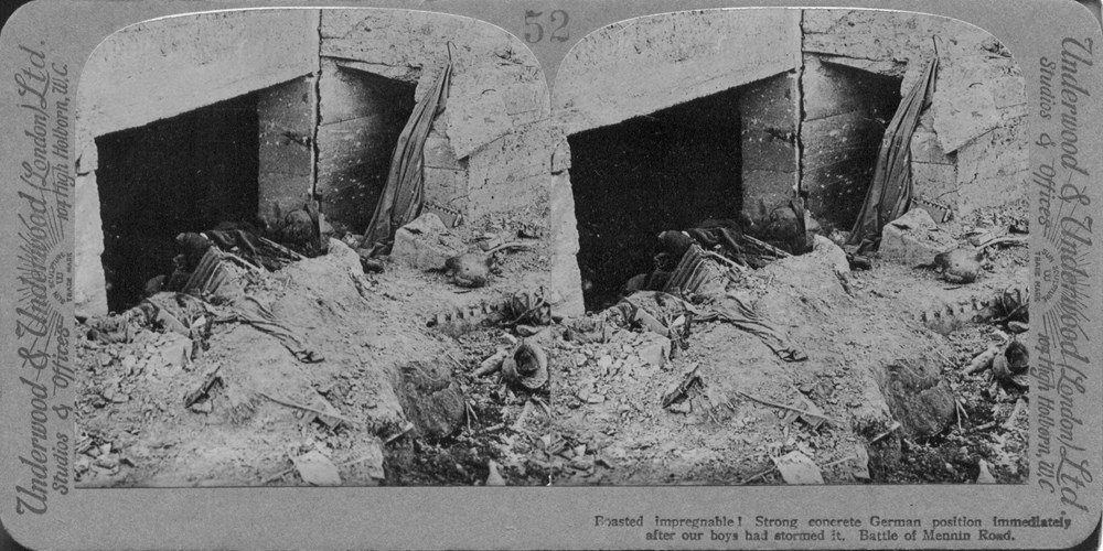 Boasted impregnable! Strong concrete German position immediately after our boys had stormed it. Battle of Mennin (sic) Road