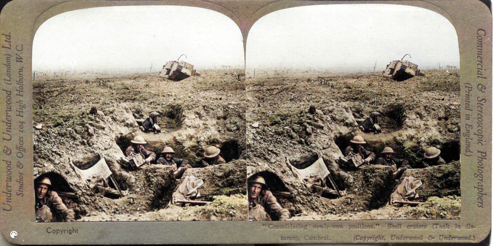 "Consolidating newly-won positions." Shell craters (Tank in distance), Cambrai