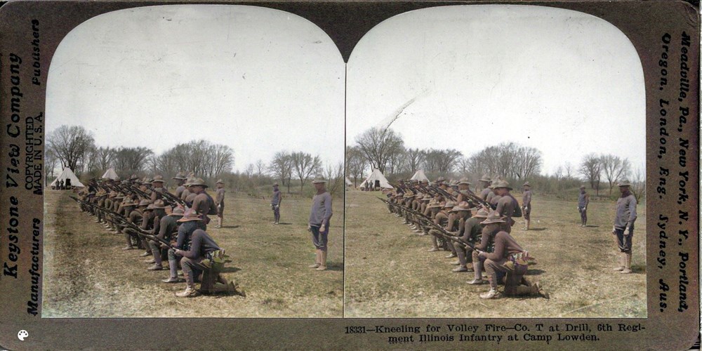 Image Id: 956 Contributor: The Jordan/Ference Collection Theatre: Home Front Subject: Training Location: Camp Lowden, Illinois, USA Regiment: Illinois Infantry Regiment Service Arm: Unknown Battle: Unknown Date: Unknown Combatants: American Publisher: Keystone View Co Source: American Directory: 18000-18599