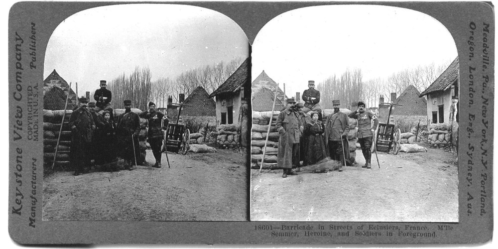 Barricade in Streets of Eclusiers, France, M'lle Semner, Heroine, and Soldiers in Foreground