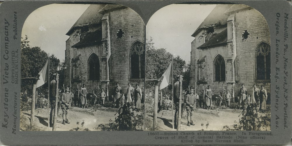 Ruined Church at Sompul, France. In Foreground, Graves of Staff of General Barbode (Nine Officers) Killed by Same German Shell