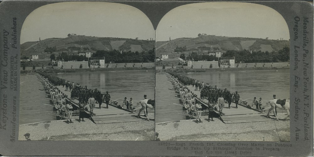 Regt. French Inf. Crossing Over Marne on Pontoon Bridge to Take Up Strategic Position in Preparation for the Great Drive