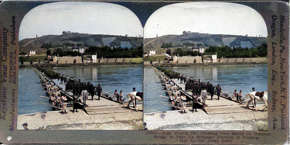 Regt. French Inf. Crossing Over Marne on Pontoon Bridge to Take Up Strategic Position in Preparation for the Great Drive