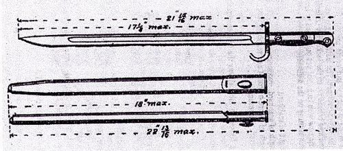 Early issues had a hooked quillion on the crossguard. This was intended to catch the opponent's blade during bayonet fighting. In reality a soldier in battle would have other things on his mind than concentrating on catching an opposing blade, and the hooked quillion was discontinued in 1913.