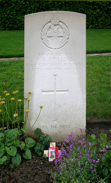 The battalion was then sent, in May 1918, to the quieter area of the Aisne where there was no immediate or apparent threat. At this point, the battalion, now part of the IX Corps, was under the command of the French Sixth Army. However, in the early morning of 27 May, the Germans unleashed a fierce bombardment (in 'Bruchmüller' fire pattern) at 1.00 am. My grandfather, George Collins, a Lewis gunner, was shot and later died of his wounds. Details of the action are described in extracts from the 2nd Bn, East Lancashire Regimental Diaries given to me by the archivist at the Duke of Lancaster's Regiment, in Preston, Lancashire.