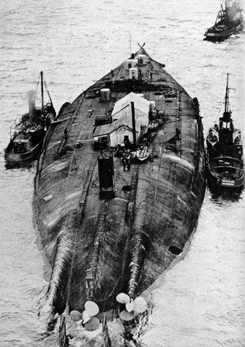 Inevitably, a gale blew up on the open sea, and as she wallowed helplessly in the rough water compressed air escaped. The powerful tugs could not make headway against the fierce wind and the little convoy was blown backwards for a while, dragged by the leviathan of the wreck, which sank six feet in the storm. Once it had blown over, more air was pumped into the hull. They reached the Firth of Forth without further incident.
