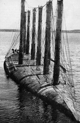 The Moltke lay upside down in about 80 feet of water, and at an angle which left part of her level with the surface at low water. To get at her plates Cox’s men had to dig through masses of marine vegetation. To raise her they used a method new to them, but not original: plug every hole in the hull and fill it with compressed air. Air–locks, like chimneys, made from old boilers welded together, were specially made at Lyness and welded to the hull and braced with guys, so that workers could get into the hull without losing air pressure, and divers could decompress in them.