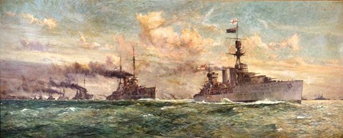 The light cruiser HMS Cardiff led the German fleet down the gap formed by the two Allied divisions. Ships’ companies were at action stations, guns loaded but trained fore and aft.