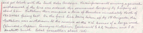4. The account of the action in 2nd Worcestershire’s War Diary (WO 95/1351/1) written by Lieutenant G Stoney, Acting Adjutant, is brief and matter-of-fact. The number of casualties is considerably underestimated.
