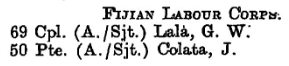 A minor error in the CWGC records has resulted in Lekima being recorded as serving in ‘67th Coy.’ of the Fijian Labour Corps, obviously confusing his service number with a non-existent company in this small unit.